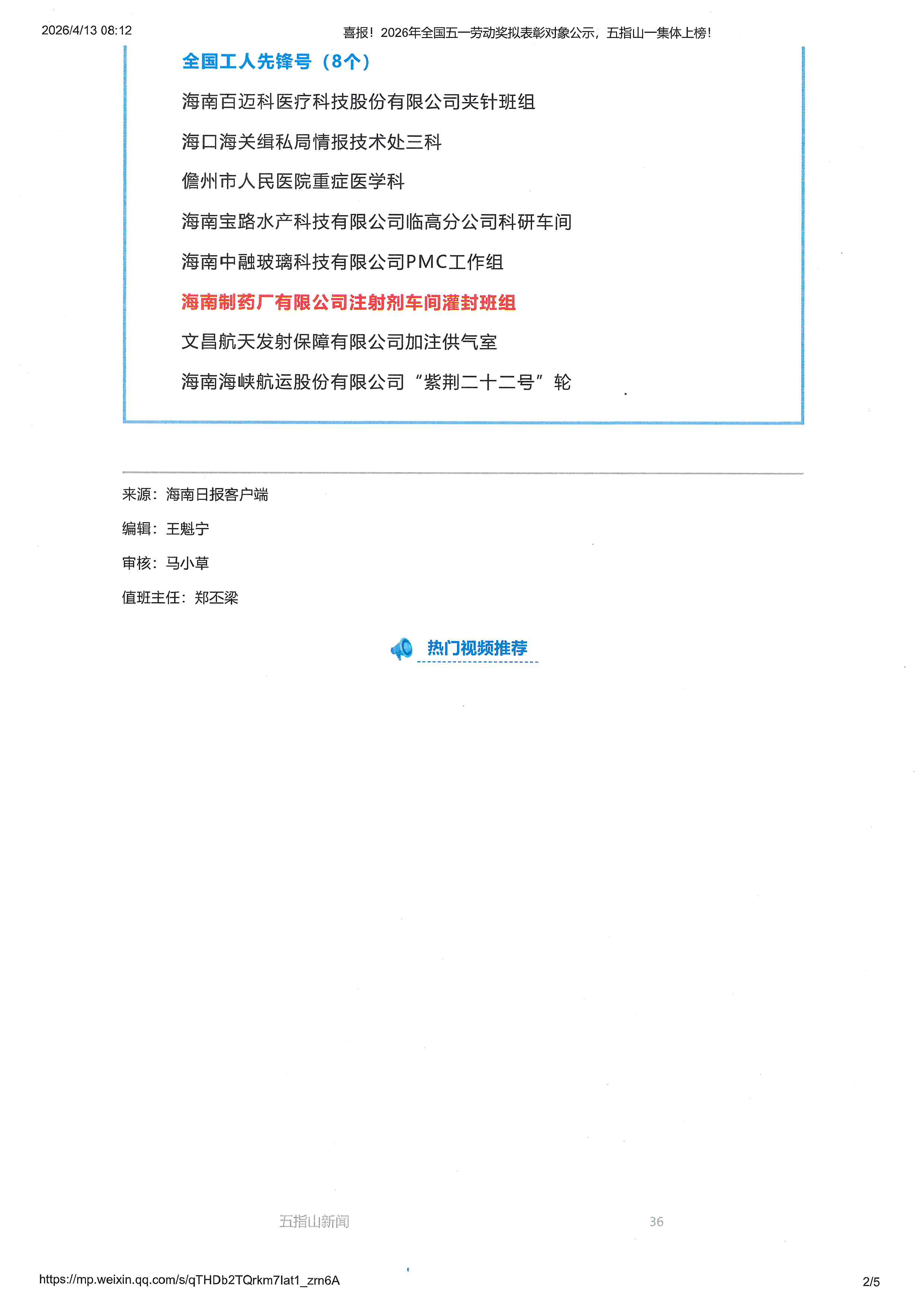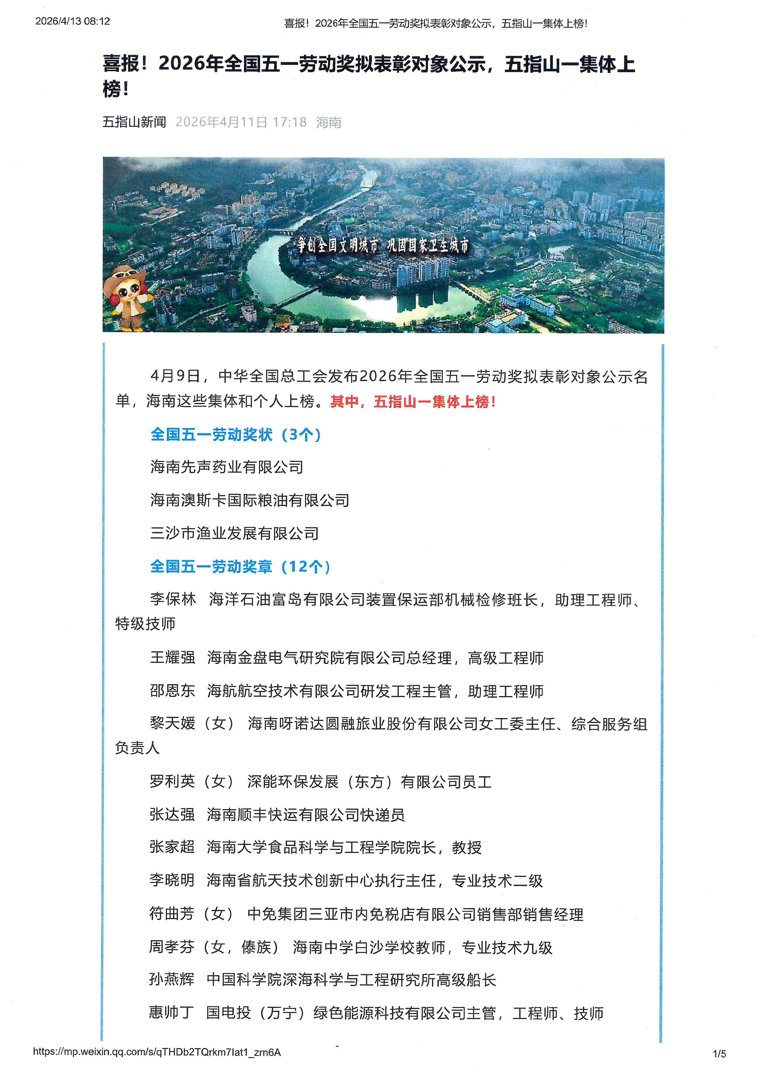 喜报! 2026年全国五一劳动奖拟表彰对象公示,五指山一集体上榜!